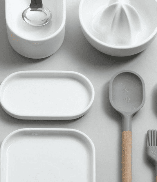 The aesthetic is built on primary geometric forms with soft, continuous transitions to create a quiet, approachable silhouette. The functionality is organized through clear visual segmentation, logically stacking the distinct food categories.